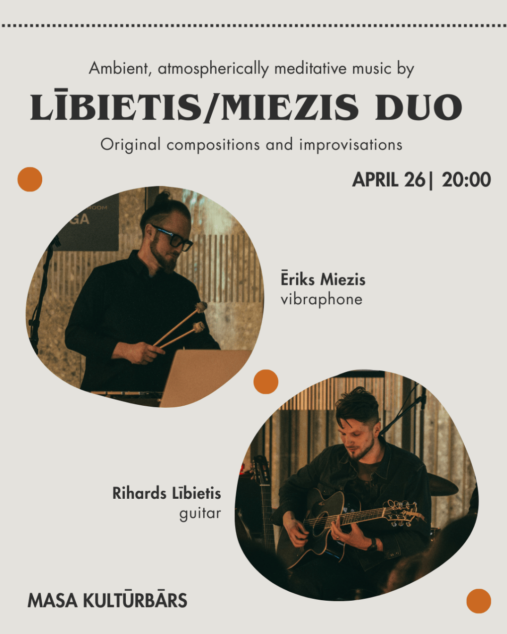 On April 26 at 20:00, MASA invites you to an intimate evening of refined, atmospheric music with guitarist Rihards Lībietis and vibraphonist Ēriks Miezis.