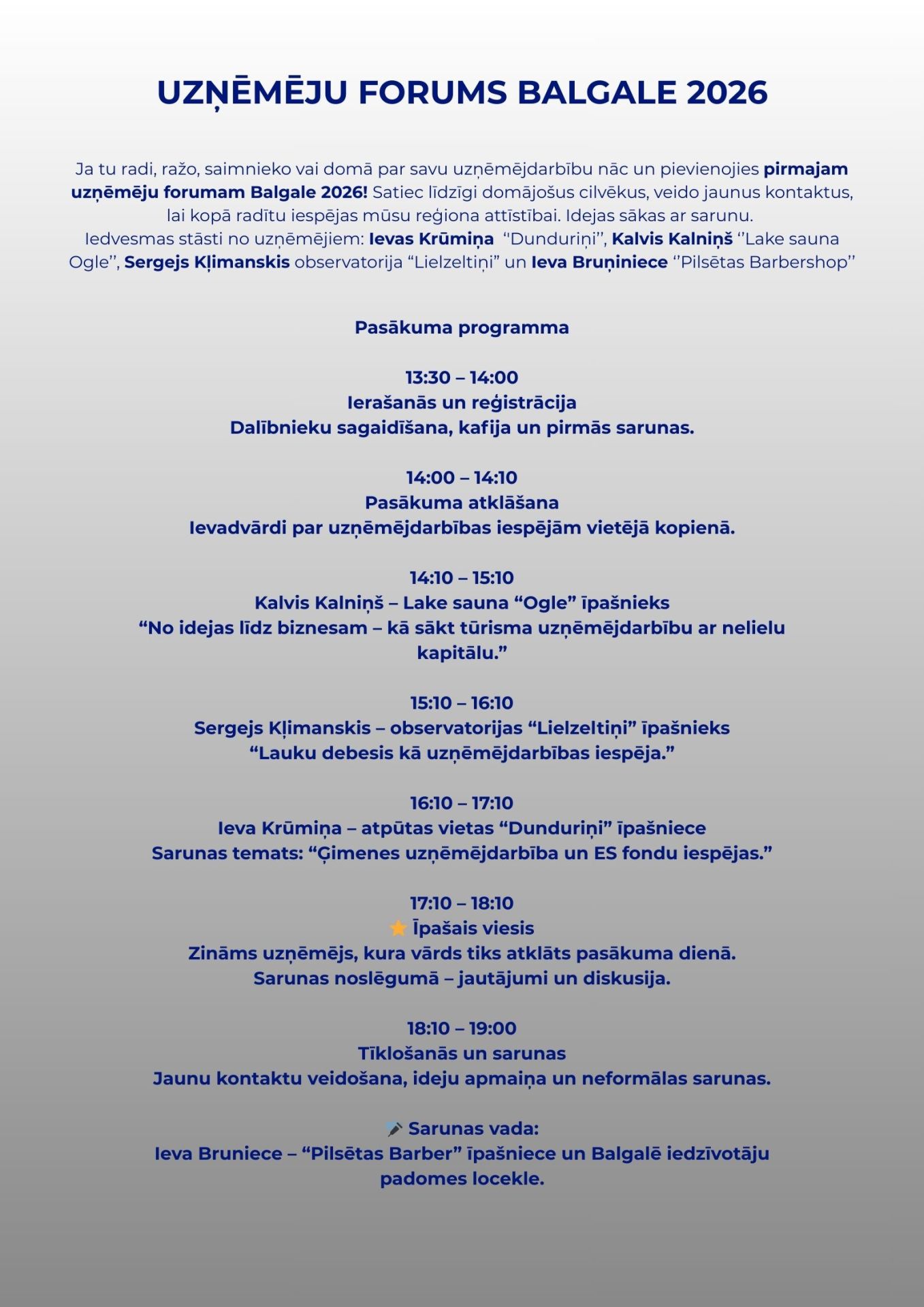 Ja tu radi, ražo, saimnieko vai domā par savu uzņēmējdarbību nāc un pievienojies pirmajam uzņēmēju forumam Balgale 2026! Satiec līdzīgi domājošus cilvēkus, veido jaunus kontaktus, lai kopā radītu iespējas mūsu reģiona attīstībai. Idejas sākas ar sarunu.