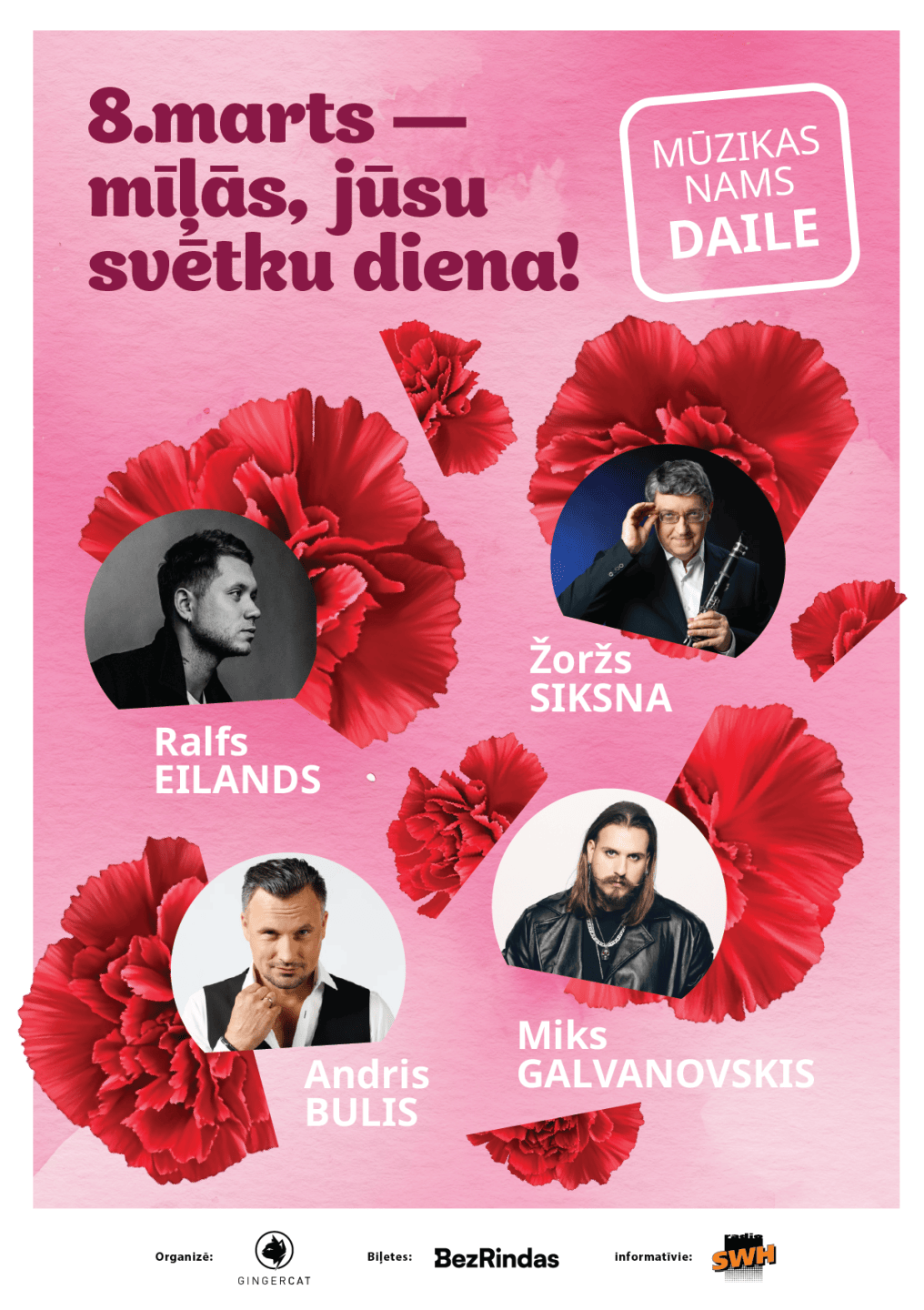 Uz skatuves kāps leģendārais Žoržs SIKSNA, harizmātiskais Ralfs EILANDS, “roķīgais” Miks GALVANOVSKIS un šarmantais Andris BULIS. Katrs ar savu balsi, stāstu un emociju gammu centīsies iepriecināt un izklaidēt visas jaukās dāmas šajā īpašajā dienā.