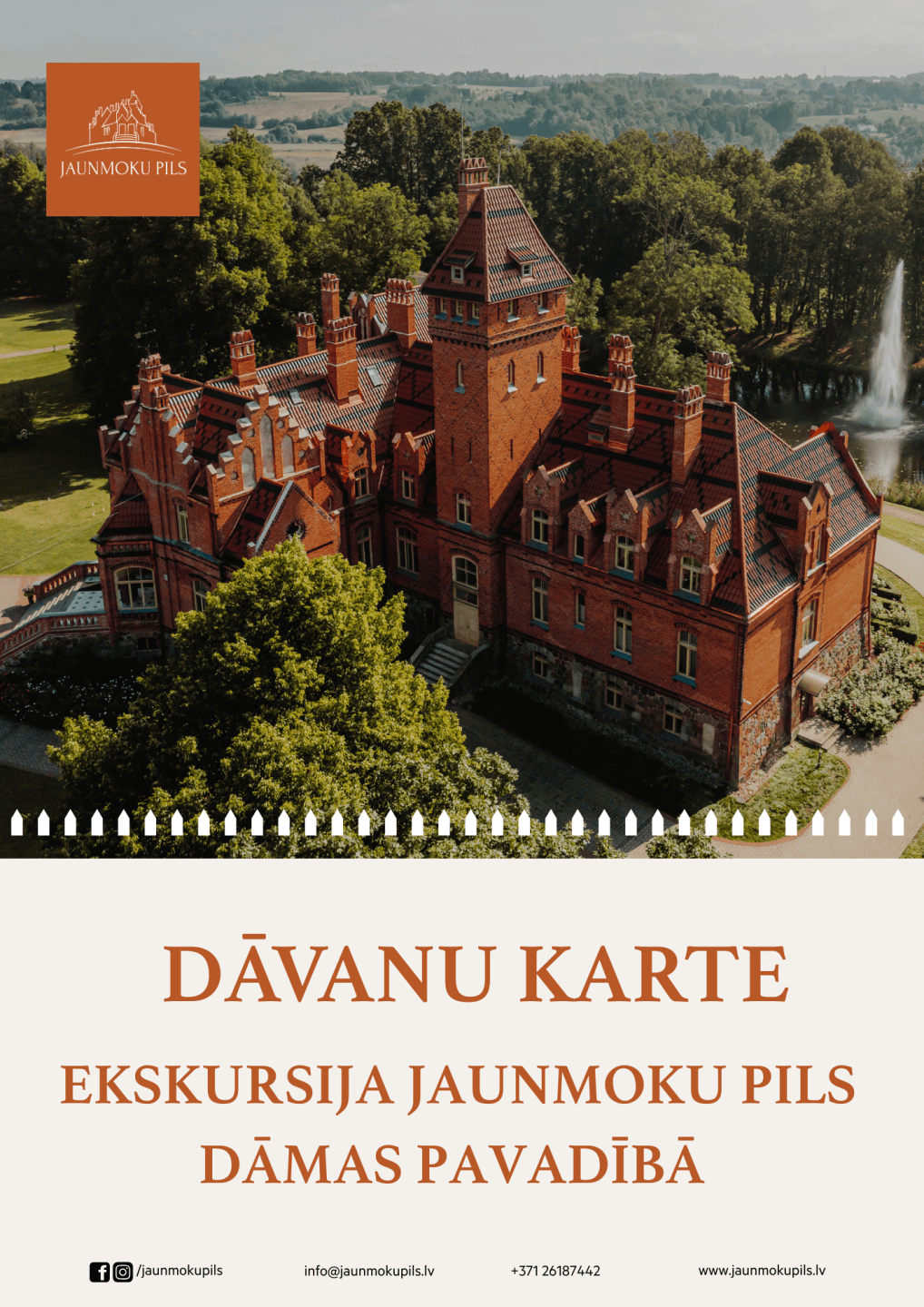 Dāvanu karte ietver Jaunmoku pils apmeklējumu ar gidu latviešu valodā divām personām.