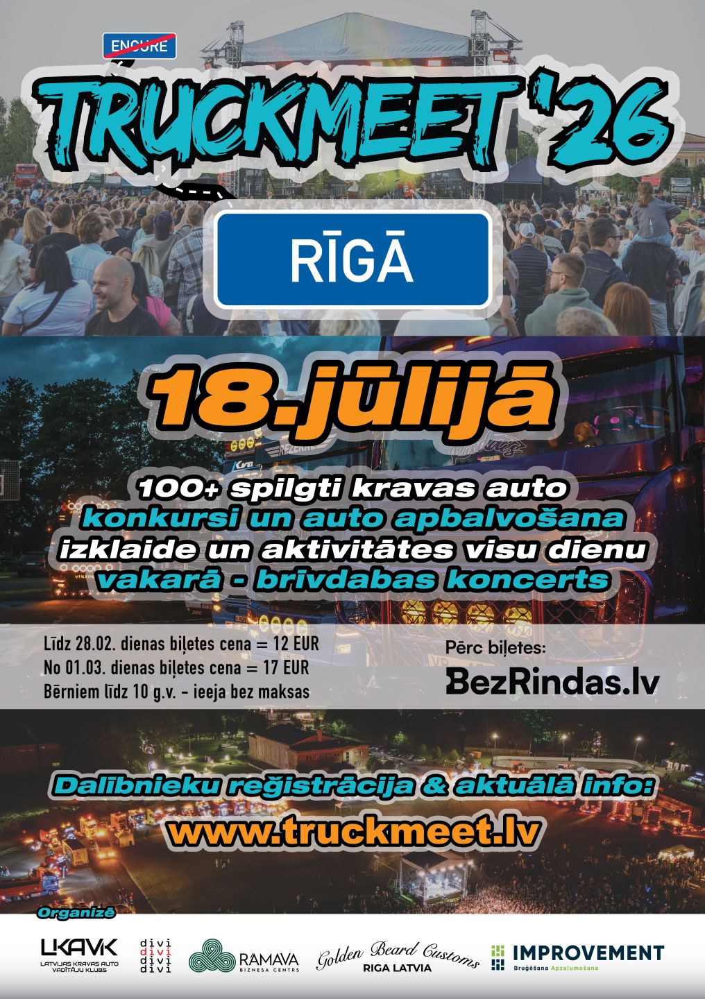 TRUCKMEET '26 ir Latvijā lielākais pasākums kravas auto vadītājiem un nozares entuziastiem, kas 2026. gadā paplašinās un maina savu norises vietu, pārceļoties uz Rīgu. Pasākums, kas aizsākās Engurē, šogad pulcēs vēl nebijušu skaitu pašmāju un ārzemju spēkratus, profesionāļus un interesentus biznesa centrā "RĀMAVA".