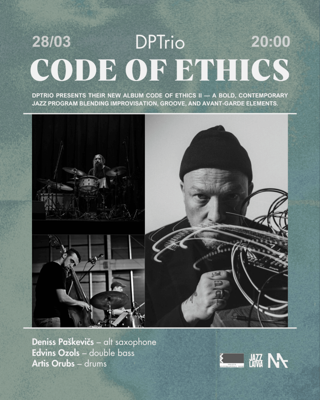 Саксофонист Денис Пашкевич вместе с контрабасистом Эдвинсом Озолсом и барабанщиком Артисом Орубсом представит программу, основанную на новом альбоме Code of Ethics II. Альбом был записан в Риге на студии Serviss и является результатом коллективной работы — все композиции созданы самими участниками трио. Звучание ансамбля отличает творческая смелость, ясный музыкальный язык и некоммерческий подход, в котором органично переплетаются элементы джаза, фанка, рока и авангарда.