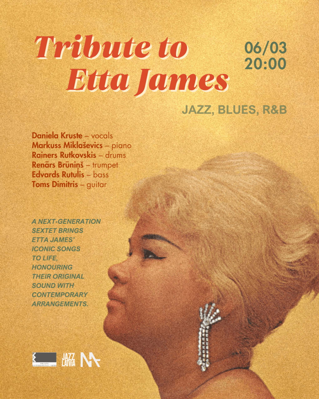 В этот вечер секстет нового поколения музыкантов оживит легендарные песни Этты Джеймс, сохраняя их оригинальное звучание и добавляя современные аранжировки.